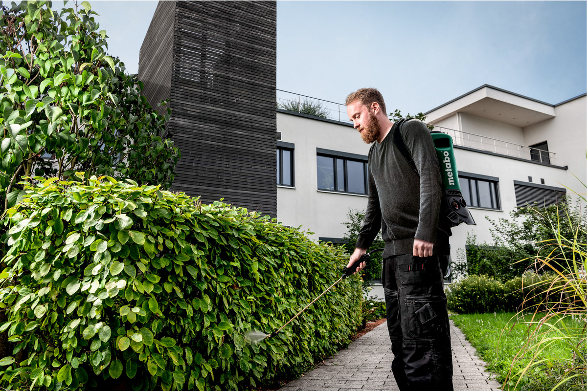 • Battery-powered backpack sprayer for uniform spraying of plants without manual pumping